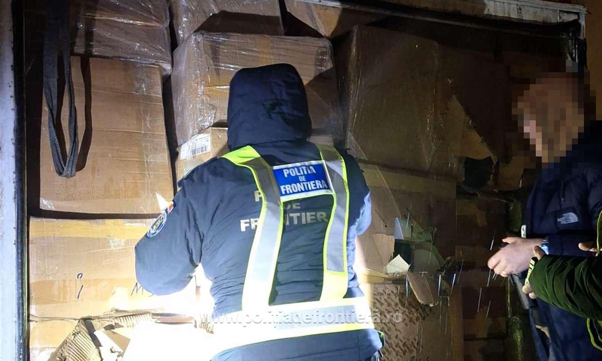 Polițiștii de frontieră din cadrul Inspectoratului Teritorial al Poliției de Frontieră Giurgiu au descoperit, în noaptea de 22 februarie 2026, pe autostrada A2, la stația de taxare Fetești, peste 30.000 de articole susceptibile a fi contrafăcute și mii de pachete de țigări de proveniență duty-free, ascunse într-un autocamion înmatriculat în România. Valoarea totală a bunurilor ridicate depășește 7,1 milioane de lei, iar șoferul, cetățean turc, a fost arestat preventiv pentru 30 de zile.